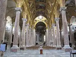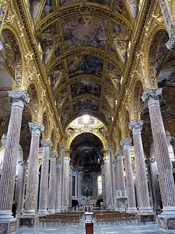 El interior, grande y brillante, restaurado después del severo daño de la Segunda Guerra Mundial, tiene planta de cruz latina con tres naves y una serie de capillas en las naves laterales, enriquecidas con frescos, pinturas, mármoles con incrustaciones y estucos en oro puro, obra de los mejores artistas genoveses del siglo XVII.