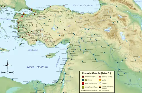 Cuando se aproximó al enemigo, el procónsul se enteró de que el ejército de Mitrídates sumaba unos 300.000 hombres, entre soldados, personal de marina y personal auxiliar no combatiente, y recibía suministros por mar y tierra. Lúculo decidió colocar su castra (campamento) cerca del póntico, en una colina fácilmente defendible, desde donde podía obtener suministros y cortar las líneas de provisiones enemigas.[3] Pero para lograr aquello debía atravesar un estrecho paso defendido por un grueso contingente póntico mandado por Taxiles, sin embargo, tuvo la suerte que los oficiales romanos al servicio de Mitrídates se enteraron de la muerte de Sertorio y decidieron establecer comunicaciones secretas con Lúculo, quien les prometió su perdón pero a cambio debieron persuadir a Mitrídates de retirar sus tropas del paso asegurándole que si dejaba al enemigo acercarse las dos legiones de Fimbria desertarían.[3]