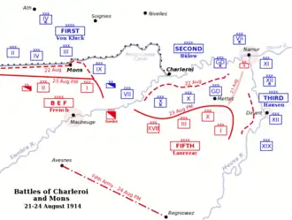 El 2.º Ejército alemán inició la batalla con varios ataques sobre el Sambre, estableciendo dos cabezas de puente que la escasa artillería francesa no pudo destruir. El 22 de agosto, Bülow atacó con 3 cuerpos de ejército directamente con el frente del 5.º Ejército. La lucha continuó hasta el 23 de agosto, cuando el centro del frente francés se vio obligado a retroceder. Mientras tanto, el 3.º Ejército había logrado cruzar el río Mosa, lanzando un ataque frontal contra el flanco derecho francés. Lanrezac ordenó la retirada general de los restos del 5.º Ejército ante el avance del 3.º Ejército alemán que amenazaba con cortar sus líneas de suministro, lo cual hubiera supuesto el cerco y aislamiento de los franceses. La retirada salvó al ejército francés de sufrir una derrota mucho mayor, pues impidió el envolvimiento de los franceses tal como estaba previsto en el Plan Schlieffen alemán. Esta derrota, unida a la sufrida en la batalla de San Quintín de 1914, empujó a los franceses a pocos kilómetros de París.
