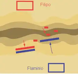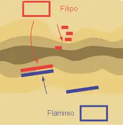 Segunda fase: el ala derecha romana carga contra la izquierda macedonia, que estaba desordenada en la cima de las colinas.