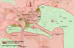 El 25 de octubre, el Ejército Sirio lanzó ataques con cohetes y con tanques pesados en el suburbio de Harasta, tras la captura rebelde de dos puntos de control militar en los límites del pueblo.[15] El 26 de octubre se llevó a cabo un alto al fuego temporal debido a la festividad musulmana de Eid, que terminó en horas. Harasta fue bombardeada con artillería pesada, matando al menos a 10 personas.[16] El 27 de octubre, 8 murieron en un ataque aéreo en el suburbio rebelde de Irbeen.[cita requerida] Los ataques fueron dirigidos también contra otros suburbios de Damasco como Zamalka y Harasta, mientras los rebeldes tomaban el control de tres puntos militares en las afueras de Duma, matando a 4 soldados.[cita requerida]