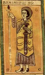 Miniatura contemporánea de Ramiro de Viguera (Ranimirus rex, "el rey Ramiro", según la inscripción), portando espada y empuñando cetro, del Codex Vigilanus | ||||