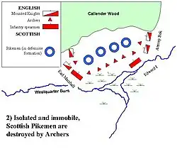 A pesar de salir bien parada de la lucha contra los caballeros ingleses la formación de falange escocesa fue aislada y bloqueada dentro de la estática formación defensiva. Eduardo entonces junto a sus arqueros con los de los otros batallones y atacó de forma despiadada mediante varias lluvias de flechas a la defensa escocesa. Los escoceses ahora no tenían donde esconderse o donde poder esquivar las flechas ya que estaban totalmente parados en su nueva posición, cosa que facilitó que los arqueros ingleses dieran de pleno en el blanco de sus objetivos. Los escoceses fueron destrozados. Perdieron estos la batalla mucho antes de que la primera andanada de flechas cayera, cuando la caballería no respondió a los ataques y esperó a que los magnates les ordenaran hacerlo. Un gran número de hombres cayeron muertos, incluido Macduff (Clan Macduff), que gobernaba la región de Fife. Los supervivientes, incluido William Wallace, huyeron lo mejor que pudieron. Esta fue la primera gran victoria de los arqueros en batalla campal.
