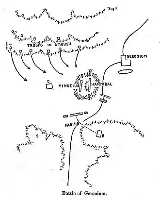 Esta táctica militar se estaba volviendo impopular en Roma, y Fabio se vio obligado a volver a Roma para defender sus acciones bajo la excusa de la observancia de algunas obligaciones religiosas. Mientras tanto, Marco Minucio Rufo, su magister equitum, quedó al mando, y fue capaz de tomar a los cartagineses con la guardia baja cerca de su campamento de Geronium e infligir duras pérdidas en una importante escaramuza. Esta victoria hizo que los romanos, descontentos con Fabio, elevasen a Minucio a un rango igual que el del dictador: Minucio tomó el mando de la mitad del ejército y acampó en un campamento separado del de Fabio, cerca de Geronium. Aníbal, informado de estos hechos, creó una elaborada trampa que atrajo a Minucio y a su ejército para luego atacarlo desde todos los flancos.