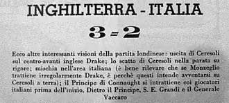 - ↑ a b c d Daily Mail, ed. (12 de noviembre de 2014). «The day England gave Mussolini a bloody nose! All hell broke loose when Italy came to Highbury in 1934» (en inglés). Consultado el 3 de febrero de 2018.