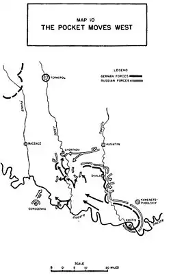 La localidad de Kamianets-Podilski era ahora el centro de un área cercada por el Ejército Rojo. Las tropas alemanas, formadas por cerca de 200,000 hombres, tenían suficiente comida y municiones para dos semanas, pero el combustible era escaso y por ello solo se distribuyó a los tanques; a ello se agregó que la nieve propia de la época impedía un suministro aéreo masivo por parte de la Luftwaffe. El general Hube ordenó entonces que las unidades al sur del Dniéster avanzaran en sentido meridional para intentar romper el cerco, pero fracasó pues los soviéticos notaron la maniobra y aumentaron la presión en ese sector.