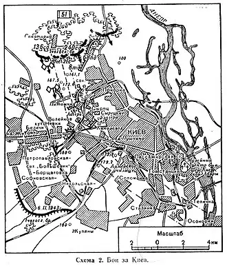 A finales de septiembre de 1943, las tropas del Frente de Vorónezh (que fue renombrado como Primer Frente Ucraniano a finales de octubre), capturaron las cabezas de puente de la orilla derecha del río Dniéper, al norte y al sur de Kiev, e intentaron liberar la ciudad dos veces. El ataque principal se dirigió desde la cabeza de puente de Bukrinski, con un ataque auxiliar desde la cabeza de puente de Liutezhski.