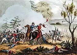 Mientras la brigada avanzaba, cayó una copiosa y cegadora lluvia de granizo que inutilizó los mosquetes de ambos bandos.[72]​ Amparado en la cobertura de la reducida visibilidad, Latour-Maubourg lanzó a dos regimientos de caballería contra el expuesto flanco derecho de Colborne. Los lanceros vistulanos y los húsares arrasaron a una infantería británica que no estaba preparada y aniquilaron virtualmente los tres primeros regimientos de Colborne. Solo el cuarto, el 31.º Regimiento de Infantería, fue capaz de salvarse formando en cuadros.[69]​ La caballería se lanzó contra la batería de artillería que daba apoyo a Colborne y capturó sus cañones, la mayoría de los cuales fueron después recuperados.[73]