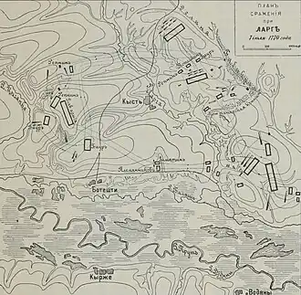 En la madrugada del 7 de julio de 1770, las tropas rusas atravesaron el río Larga, del otro lado del cual se hallaba el campamento de Kaplan Giray. A las 4 de la madrugada se inició el combate con el bombardeo de la artillería rusa. Los soldados rusos resistieron los ataques de la caballería tártara, que hubo de retirarse con importantes bajas. Sobre las doce del mediodía las tropas rusas habían ya tomado cargando a bayoneta el campamento otomano, provocando la retirada de las tropas otomanas y tártaras.