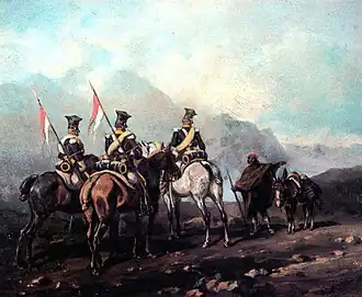 Pronto los lanceros liderados por Konopka se encontraron con dos regimientos de la caballería española. Konopka gritó: "¡Adelante, muchachos!" [4] a la octava compañía, que apuntó con sus lanzas y atacó con fuerza. Fue el Regimiento de Carabineros Reales, un regimiento muy conocido en el Ejército español, el que bloqueó la estrecha carretera al borde de un precipicio, dejándoles sin posibilidad de avanzar ni retroceder. [10]