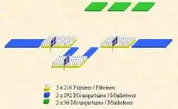 - ↑ Táctica de los tercios españoles en la que una unidad de arcabuceros o mosqueteros se entrega una salva a bocajarro contra el enemigo antes de cargar.[31]