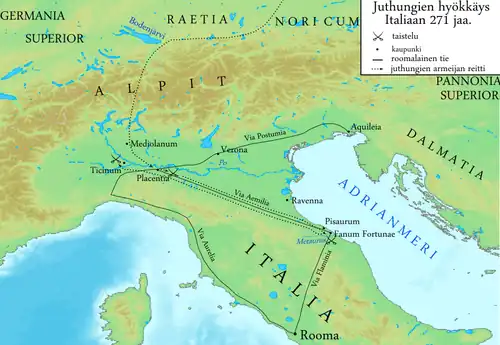 Aureliano no se amilanó, reconcentró sus fuerzas, siguió la estela de devastación que dejaba el enemigo a medida que avanzaba por la Vía Emilia, cruzaba los Apeninos hacia la costa adriática y saqueaba las indefensas villas de Pisaurum y Fanum Fortunae. Luego empezaron a seguir la Vía Flaminia para atacar la Italia central y la propia Roma.[41] Se sabe que el emperador consiguió vencerlos en Fanum y a orillas del río Metauro.[42][43][44] Los bárbaros fueron inmovilizados con el río a sus espaldas y a medida que su línea retrocedió muchos acabaron en sus aguas y se ahogaron.[41]