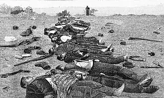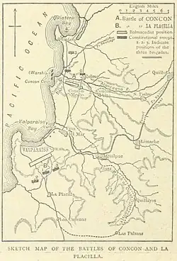 ![]() Reproducción fotográfica de un dibujo que representa la batalla de Placilla, última batalla de la Guerra Civil de 1891. Librada en las afueras del puerto de Valparaíso. | ||||