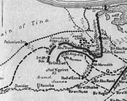 La infantería de la división 52.ª se unió a dos brigadas a caballo en Romani entre el 11 de mayo y el 4 de junio, cuando el ferrocarril hizo posible el transporte y el aprovisionamiento de un número tan grande de soldados. La infantería ocupó una posición defensiva conocida como cresta Wellington, frente a un campo de dunas.[18][44] La zona que favorecía la defensa, las dunas de arena que se extendían unos 10 km y cubrían un área de 78 km² al sur de Romani, incluía el norte de la ruta de El Arish. En los bordes del sur y el sureste, una serie de dunas de arena móvil con laderas inclinadas que conducían a una meseta de arena fina y profunda.[45]