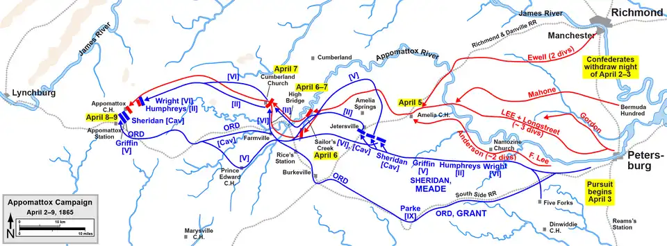 La mayor parte del ejército confederado había marchado unas 21 millas (34 km) hacia el oeste el 3 de abril.[10] Para reunirse en el punto de encuentro de Amelia Court House que había sido designado por el general Lee, todos los comandos confederados, excepto los del teniente general Richard H. Anderson y el general de división Fitzhugh Lee, tendrían que cruzar el río Appomattox, que gira bruscamente hacia el norte no muy lejos del oeste de los campamentos confederados en la noche del 3 de abril.[11] El 4 de abril, la mayor parte del ejército confederado que se desplazaba hacia el lado sur del río Appomattox tuvo que utilizar una única carretera embarrada o tomar rutas muy tortuosas debido a las inundaciones y a la falta de puentes en otras carreteras, lo que retrasó el avance hacia el punto de encuentro de Amelia Court House.[12]