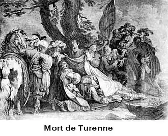 Preocupado por mantener fuera de peligro a su joven sobrino, el duque de Elboeuf, le dijo al muchacho: “Quédate donde estás, que se sabe que me acompañas siempre a caballo y me reconocerán”.[4] El Marqués de Saint Hilaire y otro oficial preguntaron a Turena cuáles eran las disposiciones que debía tomar la columna de ataque, y Turena subió a un montículo que había cerca. Montecuccoli observó una capa roja y ordenó a los artilleros que se hiciera fuego contra aquella posición. Saint Hilarie estaba preguntando al Mariscal si aprobaba la posición de las tropas, cuando Turena se inclinó acia el pomo de la silla. El caballo comenzó a andar y cuando se detuvo, Turena se cayó de la silla de montar en los brazos de sus asistentes. Abrió los ojos dos veces y luego los cerró para siempre. La misma bala arrancó el brazo a Saint Hilaire.[4] Se hicieron grandes esfuerzos por ocultar la muerte del Mariscal, pero al ver las lágrimas que el duque de Elboeuf derramó en un manto que cubría algo en el suelo, los soldados comprendieron la catástrofe.