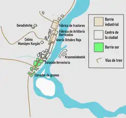 La ciudad que tenía una importante industria militar (Fábricas octubre Rojo, de tractores y de cañones Barrikady) y poseía el nudo ferroviario más extenso del país, ya que unía Moscú, el mar Negro y el Cáucaso, existiendo igualmente un puerto fluvial en servicio para la navegación por el Volga. La urbe se extendía unos 24 kilómetros a lo largo de la orilla occidental del Volga, pero con menos de diez kilómetros de anchura. No existía ningún puente cruzando el río, empleándose grandes barcazas para comunicar ambas orillas. La orilla oriental apenas estaba poblada. Es importante considerar que la temperatura en el Cáucaso es muy extrema tanto en verano como en invierno, durante el cual el frío es tal que el Volga se congela con una capa suficientemente gruesa de hielo como para permitir el paso de vehículos pesados.