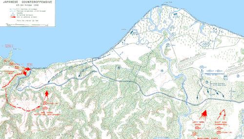 Estas unidades aumentaron en 1500 soldados las fuerzas de Vandergrift, que ya contabilizaban 11 000 elementos para defender el Campo Henderson.[52] El Primer Batallón de Paracaidistas, el cual había sufrido severas bajas durante la batalla de Tulagi y Gavutu-Tanambogo en agosto, fue puesta bajo el mando de Edson.[53] Otro batallón que fue reubicado fue el Primer Batallón del Quinto Regimiento de Marines, el cual desembarcó en botes al oeste del Matanikau, cerca del poblado de Kokumbuna, el 27 de agosto con la misión de atacar las unidades japonesas en el área, casi del mismo modo como ocurrió durante las primeras acciones del 19 de ese mes. En esta ocasión, sin embargo, los Marines vieron obstaculizada su misión debido a lo difícil del terreno, el ardiente sol, así como mejores defensas instaladas en el lugar. Al día siguiente los Marines descubrieron que los ocupantes japoneses se habían retirado durante la noche, por lo que regresaron al perímetro de Lunga en bote.[54] Las bajas durante este enfrentamiento fueron de 20 japoneses muertos por 3 estadounidenses.[55]