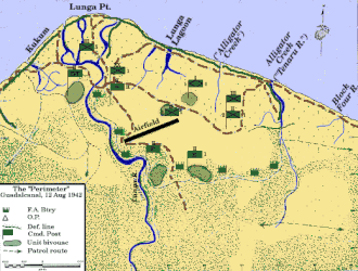 Los once mil infantes de marina destacados en Guadalcanal se concentraron inicialmente en formar un perímetro defensivo alrededor de Punta Lunga y el aeródromo, en trasladar hasta él los suministros desembarcados y en finalizar la construcción del aeródromo. En cuatro días de intenso esfuerzo, los abastatos fueron llevados desde la playa hasta distintos depósitos dentro del perímetro. El trabajo para concluir el aeródromo comenzó inmediatamente, principalmente mediante el uso del equipo que los Aliados habían arrebatado a los japoneses. El 12 de agosto se bautizó al aeródromo con el nombre de Campo Henderson, en honor al piloto Lofton R. Henderson, que había muerto durante la batalla de Midway; el 18 de agosto ya estaba operativo.[35] Durante el asalto se habían desembarcado víveres para cinco días, pero, gracias a las provisiones capturadas a los japoneses, los infantes contaban con suficiente alimento para catorce días.[36] Con el objetivo de conservar las provisiones, las tropas se vieron limitadas a dos comidas por día.[37] Al poco de desembarcar, la disentería comenzó aquejar a las tropas aliadas, que sufrían uno de cada cinco soldados para mediados de agosto. A pesar de que algunos de los trabajadores coreanos se rindieron a los estadounidenses, la mayoría del personal restante de los japoneses se reunió al este del perímetro de Lunga, en la ribera oeste del río Matanikau, alimentándose básicamente de cocos. Otro puesto naval japonés se encontraba en Punta Taivu, alrededor de treinta y cinco kilómetros al este del perímetro de Lunga. El 8 de agosto, un destructor japonés proveniente de Rabaul arribó con 113 elementos para reforzar la posición en el Matanikau.[38]