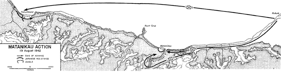 Durante la tarde del 12 de agosto, una patrulla de infantes de marina compuesta por 25 soldados (casi todos ellos personal de espionaje) y mandada por Frank Goettge desembarcó al oeste del perímetro de Lunga, entre Punta Cruz y el río Matanikau, en una misión de reconocimiento con el objetivo secundario de contactar con un grupo de japoneses que los estadounidenses creían dispuestos a rendirse. Poco después de que las tropas bajasen del bote en que viajaban, un pelotón japonés las atacó y casi las aniquiló.[39] En respuesta, el 19 de agosto Vandergrift envió tres compañías del 5.º Regimiento de Infantería de Marina para acometer al enemigo que se encontraban al oeste del Matanikau. Una compañía atacó por el banco de arena en la desembocadura del río, mientras que otra avanzó mil metros tierra adentro, donde arremetió contra los japoneses que se encontraban en el poblado Matanikau. La tercera compañía desembarcó más al oeste y asaltó el poblado de Kokumbuna. Después de ocupar brevemente los dos poblados, las tres compañías regresaron al perímetro; perdieron cuatro hombres mientras que en el bando japonés se contabilizaron sesenta y cinco bajas. Esta acción, denominada en ocasiones «primera batalla del Matanikau», fue la primera de las varias acciones a lo largo del Matanikau que se disputaron durante la campaña.[40]