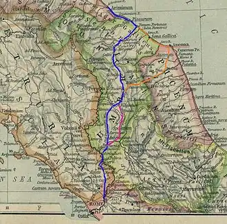 ![]() La Vía Flaminia (en azul) unía Rímini con Roma. | ||||