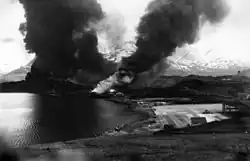 El pueblo de Dutch Harbor después del ataque japonés. -