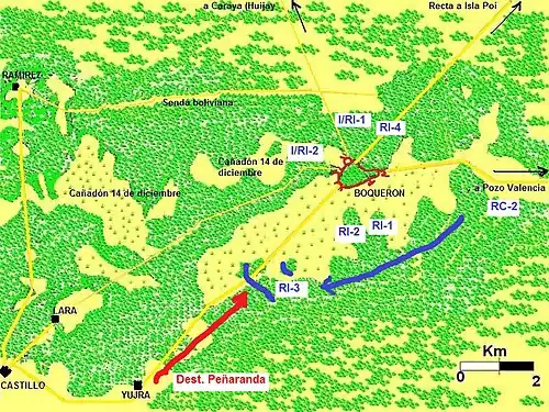 Con unidades que van completando su marcha de aproximación, el ejército paraguayo reforzó sus líneas de ataque alrededor de Boquerón y de emboscadas en toda la zona circundante. Las fuerzas bolivianas al mando de Peñaranda, atrincheradas delante de Yujra, atacaron hacia Boquerón sin poder romper el cerco enemigo. La fuerza de Peñaranda siguió aumentando con la llegada del resto del RC-6 (365 soldados).