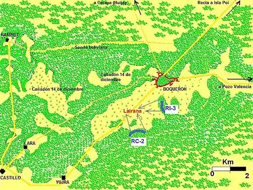 El mayor boliviano Lairana, con la 1.ª y 2.ª compañías del I/RI-14, salió hacia Boquerón con la orden de "limpiar el camino desde Boquerón hacia Isla Poí". Se asumía que los paraguayos habían huido de ese sector según el equivocado informe de Marzana y porque habían llegado a Yujra, sin problemas, dos camiones provenientes de Boquerón con heridos. El coronel Peña desconocía que él mismo corría peligro en su puesto de mando en Yujra por la presencia de patrullas enemigas en los alrededores. Pese a tener un vehículo adelantado como punta de la patrulla, al mando del teniente Luis Hugo Rada, la columna Lairana cayó en una emboscada sobre el camino Yujra-Boquerón en la que murieron la mitad de sus soldados. Lairana y algunos de sus hombres cayeron prisioneros.
