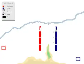 Despliegue inicial de la batalla. Romanos en rojo y cartagineses en azul. | ||||