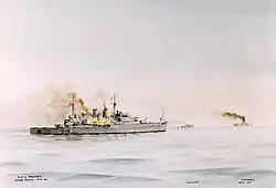 Pintura de Edward Tufnell que representa al HMS Exeter durante la batalla del Río de la Plata