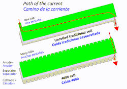 ‘Many types of battery cells are currently used as energy sources in electric vehicles and energy-storage applications. Current cells use a jelly-roll design in which the cathode, anode, and separators are rolled together and have a cathode tab and an anode tab to connect to the positive and negative terminals of the cell can. The path of the current necessarily travels through these tabs to connectors on the outside of the battery cell. However, ohmic resistance is increased with distance when current must travel all the way along the cathode or anode to the tab and out of the cell. Furthermore, because the tabs are additional components, they increase costs and present manufacturing challenges.‘‘Muchos tipos de celdas de batería se utilizan actualmente como fuentes de energía en vehículos eléctricos y aplicaciones de almacenamiento de energía. Las celdas actuales utilizan un diseño de rollo de gelatina en el que el cátodo, el ánodo y los separadores se enrollan juntos y tienen una pestaña de cátodo y una pestaña de ánodo para conectarse a los terminales positivo y negativo de la celda. El camino de la corriente viaja necesariamente a través de estas pestañas a los conectores en el exterior de la celda de la batería. Sin embargo, la resistencia óhmica aumenta con la distancia cuando la corriente debe viajar a lo largo del cátodo o el ánodo hasta la lengüeta y salir de la celda. Además, debido a que las lengüetas son componentes adicionales, aumentan los costos y presentan desafíos de fabricación.’