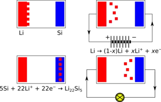 Un ánodo de silicio cristalino tiene una capacidad específica teórica de 3600 mAh/g, aproximadamente diez veces superior a la de los ánodos de grafito utilizados habitualmente (limitada a 372 mAh/g). Cada átomo de silicio puede unir hasta 3,75 átomos de litio en su estado totalmente litiado (Li3,75Si), frente a un átomo de litio por cada 6 átomos de carbono en el grafito totalmente litiado (LiC6).[24] [25]