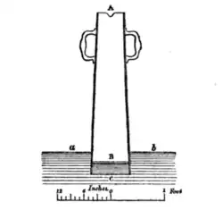 Un tamaño bastante conveniente para el instrumento representado en la figura, es hacer que la longitud AC, mida 3 pies y la boca A, donde se aplica la cara, sea de una forma ovalada irregular, permitiendo que los dos ojos puedan ver libremente a través del tubo, con un rebaje por un lado, de modo que la nariz pueda respirar libremente y no proyecte la humedad del aliento dentro del tubo. En B hay una placa redonda de vidrio de 8 pulgadas de diámetro, la cual sobre el borde C, tiene acoplada una argolla de plomo de una pulgada de espesor y 3 pulgadas de profundidad; el peso del plomo sirve para ayudar a hundir ligeramente el tubo dentro del agua. Se deben proporcionar agujeros en los lados entre B y C, para dejar escapar el aire y facilitar el contacto del agua en con el vidrio A cada lado hay un mango para poder sujetar el instrumento.[10]