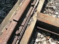 Las vigas longitudinales, y por lo tanto los carriles, se mantenían con el ancho nominal utilizando 'travesaños' - separadores de madera transversales - y barras de unión de hierro. Los travesaños evitaban que las vigas se acercaran demasiado, y los tirantes impedían que se separaran demasiado. En años posteriores, los tirantes fueron reemplazados por pernos atornillados a los travesaños. Estos pernos roscados atravesaban las vigas longitudinales por un orificio, quedando sujetos por una tuerca colocada en el lado exterior.[2]