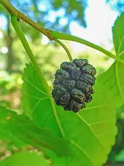 Los frutos múltiples no son bayas botánicas. Las frutas múltiples son los frutos de dos o más flores múltiples que se fusionan o se empaquetan estrechamente.[14] La mora es un ejemplo de baya de una fruta múltiple; se desarrolla a partir de un racimo de pequeñas flores separadas que se comprimen a medida que se desarrollan en la fruta.[15]