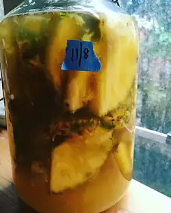 El tepache es una bebida fermentada de piña, ligeramente alcohólica (>1%). Aunque la piña es el fruto original, también se elaboran tepaches de guayaba, tuna, etc.