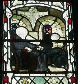 Vitrales de la catedral de Gloucester representándolo en el dictado a un escriba.