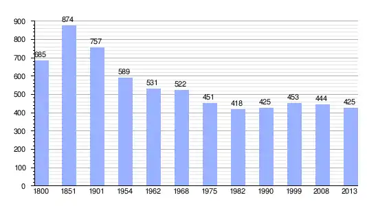 Los datos demográficos contemplados en este gráfico de la comuna de Bellou-sur-Huisne[4] se han cogido de 1800 a 1999 de la página francesa EHESS/Cassini, y los demás datos de la página del INSEE.[5]