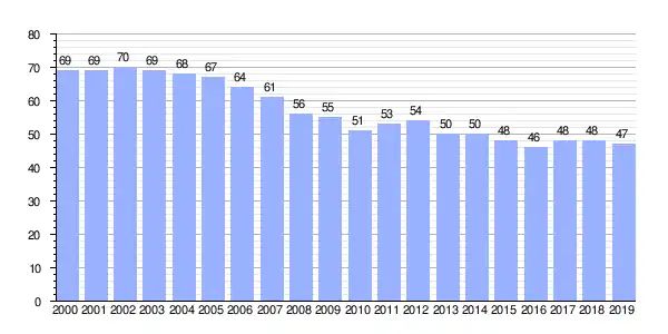 | Gráfica de evolución demográfica de Belmil (parroquia) entre 2000 y 2019 |