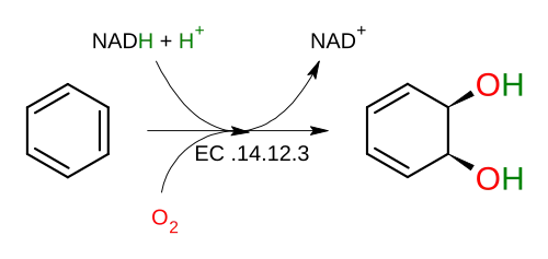 Por lo tanto los cuatro sustratos de esta enzima son benceno, NADH, iones hidrógeno y oxígeno; mientras que sus dos productos son cis-ciclohexa-3,5-dieno-1,2-diol y NAD+