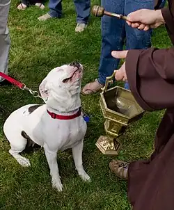 Dentro del catolicismo, es común realizar bendiciones a animales por parte de sacerdotes, principalmente a mascotas y animales que sirven de ayuda a los discapacitados, como los perros de asistencia. Dicho ritual consiste en verter agua bendita sobre el cuerpo del animal, acompañado de algún rezo u oración especial para la ocasión.[6] En algunos países, dichas ceremonias son celebradas cada 4 de octubre, en conmemoración a San Francisco de Asís, quien es considerado como el santo patrono de los animales,[7] en otros es celebrado los 17 de enero, día en que se conmemora a San Antonio Abad.[8]