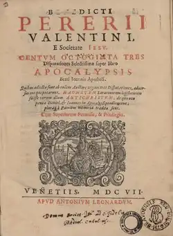 - Benedicti Pererij Valentini e Societate Iesu. Centum octoginta tres disputationes selectissimae super libro Apocalypsis beati Ioannis Apostoli. Quibus adiectae sunt ab eodem auctore viginti tres disputationes, aduersus eos qui putarunt, Maometem Saracenorum legislatorem fuisse verum illum Antichristum. Venetijs: apud Antonium Leonardum. 1607.