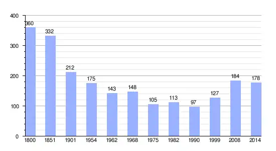 Los datos demográficos contemplados en este gráfico de la comuna de Bennetot[4] se han cogido de 1800 a 1999 de la página francesa EHESS/Cassini, y los demás datos de la página del INSEE.[5]