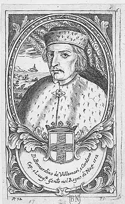 ![]() Bernardino de Villamarí e Cardona, ilustración de Domenico Antonio Parrino, Teatro eroico, e politico de governi di Vicere del Regno di Napoli Dal tempo del Re Ferdinando il Cattolico Fino al presente, Nápoles, 1692. Biblioteca Nacional de España | ||