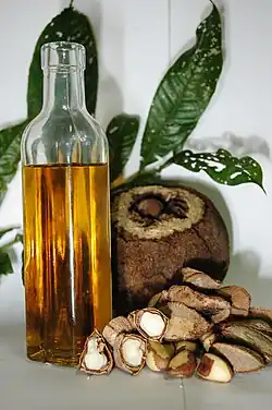 El aceite de color pardo es altamente nutritivo, que contiene ácidos grasos insaturados en un 75 % compuestos principalmente de palmítico, oleico y linoleico, y fitoesteroides sitosterol y vitaminas liposolubles A y E. Se extrae de la primera prensada, puede dar un aceite comparable al de oliva extra virgen que puede sustituirlo por su sabor suave y agradable.[11]