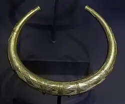 Este hallazgo está compuesto por dos torques de oro datados en torno al 1000-800 a. C. (siglos X-IX a. C.) y un pequeño cuenco (pátera) de bronce batido, en donde —al parecer— estaban depositadas dichas piezas, que son indicativas de la primigenia vinculación del hallazgo a los circuitos del metal y su cercanía geo-cronológica a la explotación estannífera tartésica del cerro de San Cristóbal en Logrosán (Cáceres) –. Fueron hallados casualmente por Domingo Sánchez Pulido en el lugar denominado "El Terrero" en la finca Los Machos propiedad de Urbano Montes Sánchez y, por Orden de 29 de mayo de 1963 fueron adquiridos por el Estado (BOE núm. 170 de 17 de julio de 1963). Desde 1964 se encuentran en el Museo Arqueológico Nacional, en Madrid.