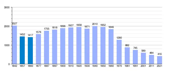 | Gráfica de evolución demográfica de Berzocana[5] entre 1842 y 2021 |