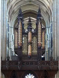 El órgano está montado sobre una pantalla de madera ricamente tallada que data de finales del siglo XIX. Hay una escalera en el pasillo norte, que habría sido utilizada en tiempos colegiales para tener acceso desde, y hacia, la sala del capítulo.