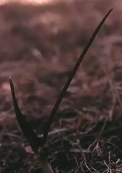 Planta perenne, glabra, con tubérculo subterráneo semiesférico hasta disciforme y tallo subterráneo de hasta 5 cm de largo. Hojas que se producen tras la inflorescencia, lineares hasta estrechamente elípticas, planas u onduladas, de 5-20 cm de largo y 5-20 mm de ancho. Bráctea de la inflorescencia (espata) de 8-20 (30) cm de largo, por la base (bajo la tierra) formando un tubo de 2,5-6 cm de largo, la parte anterior lanceolada, de color púrpura oscuro y por el exterior verdoso. La espadice o inflorescencia con flores estériles por debajo y por arriba de las flores masculinas, el apéndice delgado, de 9-16 cm de largo y hasta 3 mm de ancho, ampliamente prominente, púrpura. Bayas blancas o verdes.