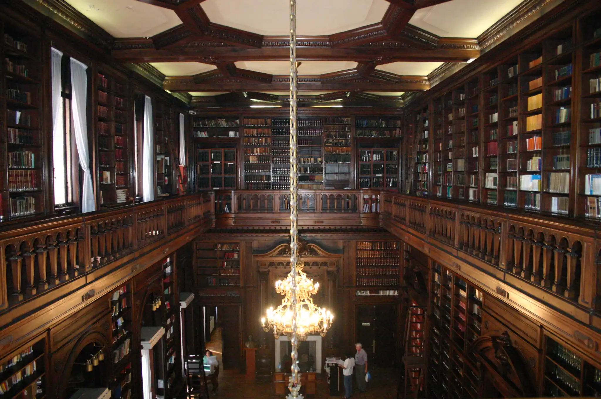 El diseño de la biblioteca es renacentista francés, revestida en boiserie de nogal de Italia, tallado en los talleres de ebanistas de la familia Tarris.[2] En el interior sobresale una gran chimenea de hierro forjado, y sobre esta se encuentra el óleo Salida del Teatro, del pintor Román Ribera. El mismo fue obsequiado por la Infanta Isabel de Borbón con motivo del Centenario de la Revolución de Mayo. Dos arañas de bronce y cristal francés de 52 luces, diseñadas por el arquitecto Héctor Ayerza, engalanan la sala de lectura.[1]